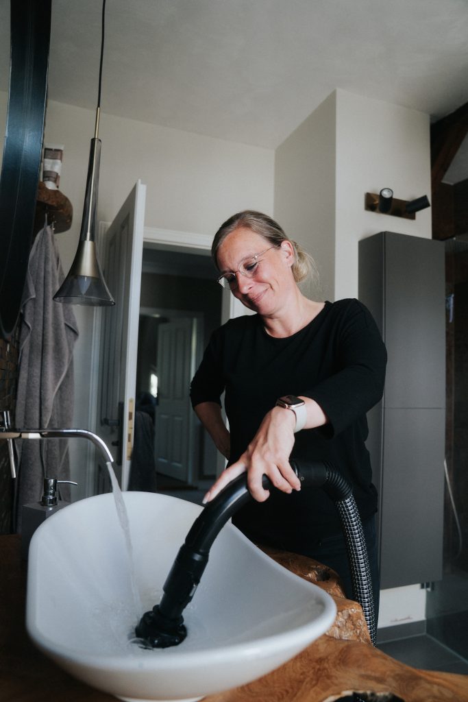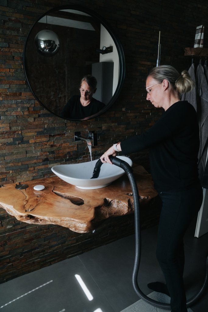 Einfach das Schmutzwasser ausgießen, den Behälter kurz ausspülen – fertig.